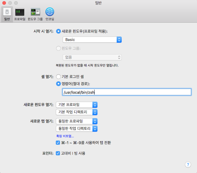 터미널 환경설정 [일발] - [셀 열기] - [기본 로그인 셀] 에서 [명령어(절대경로)]를 선택하여 which zsh 에거 얻은 경로를 넣어준다.