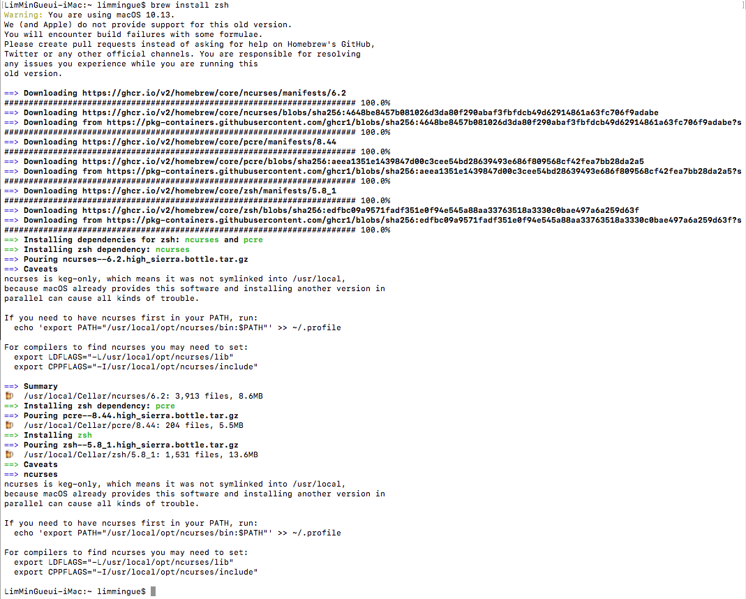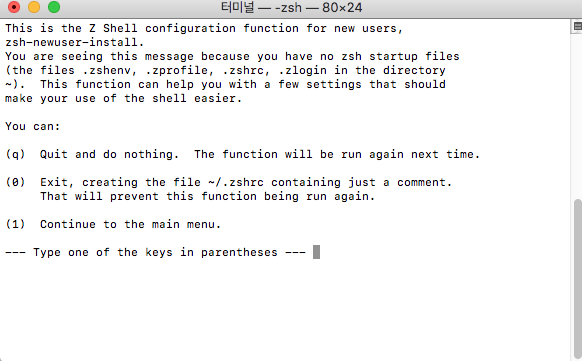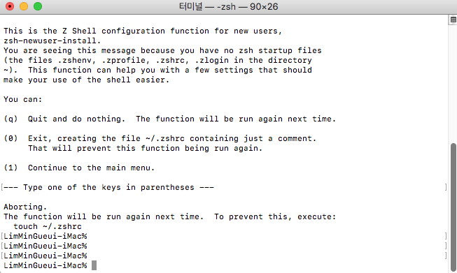 Prompt가 $에서 %로 변경된 것을 볼 수 있다. (Terminal 새창을 열어서 확인해야한다.)