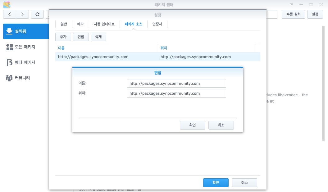 Synology NAS의 [패키지 센터]에서 설치해 주면 된다. 기본적으로 Synology에서 제공하는 패키지가 아니기 때문에 [패키지 센터]-[설정]-[패키지 소스]-[추가]에 의해서 패키지 소스를 추가해줘야 한다.