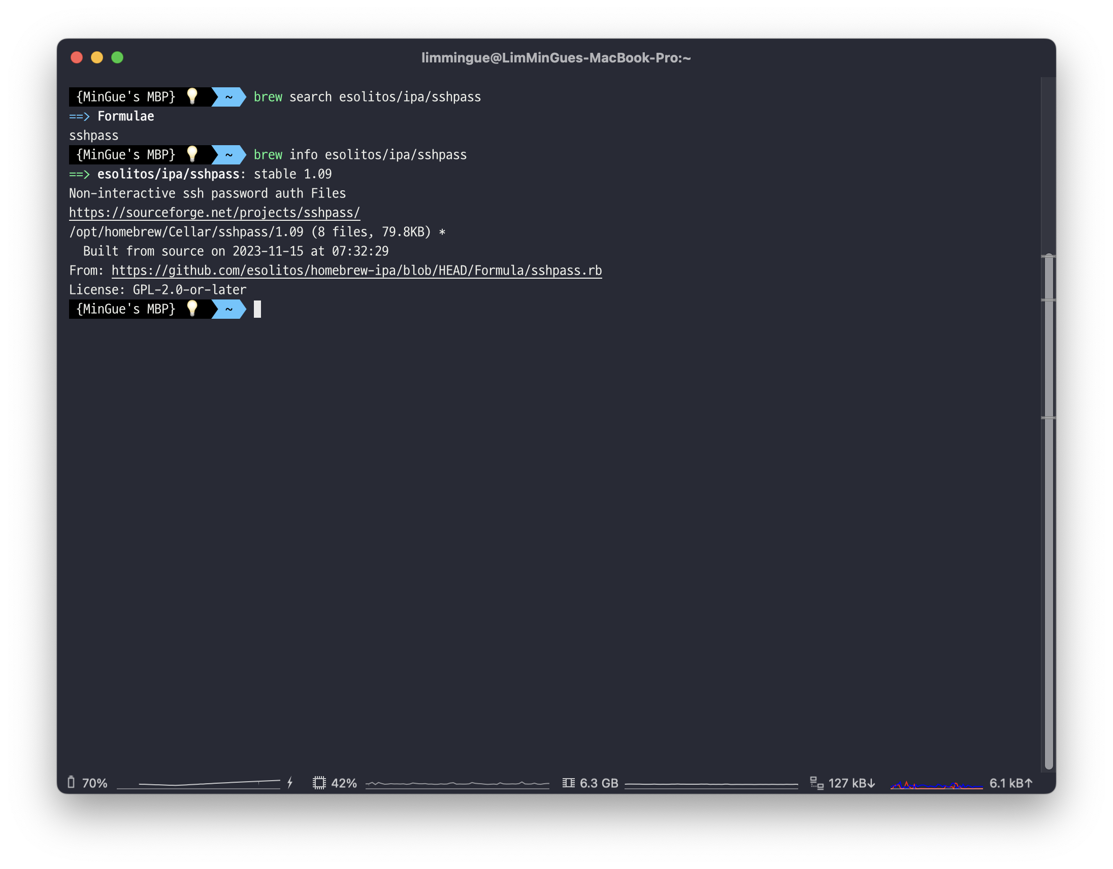 위의 화면하고 동일하지는 않겠지만 설치가 정상적으로 이루어질 것이다. 설치된 sshpass의 정보를 확인해보면...