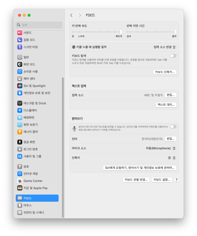 "시스템 설정"을 실행하고 제일 아래에서 3번째에 있는 "키보드"를 선택하면