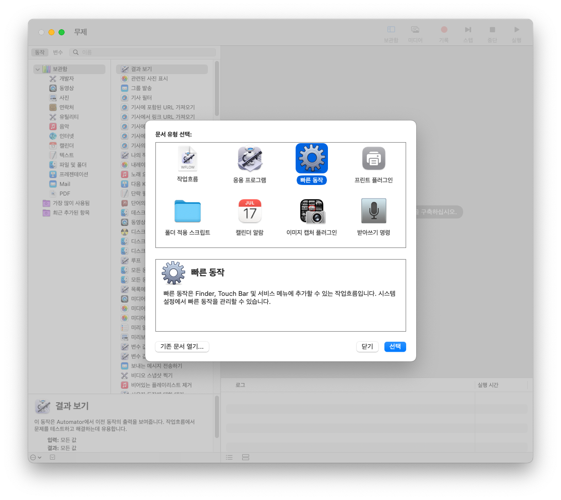 먼저 Automator를 실행하고 "빠른동작"을 선택한다.
