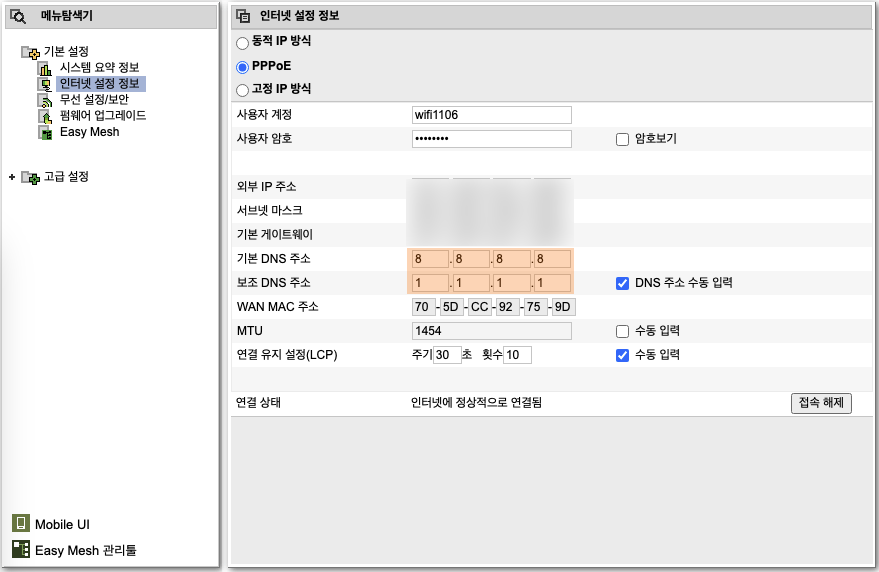 기본을 구글로 보조를 Cloudflare로 설정을 해줬다. 위의 캡쳐(IpTime 공유기에서 인터넷 설정)에서 볼 수 있듯이 "DNS 주소 수동 입력"을 선택해줬다. 나의 경우엔 집에서 사용하는 공유기(Router)를 IpTime 제품을 사용한다. 가성비 좋고 한국 기업의 제품이라 한글화 되어 있고 서비스 문의에 대한 회신이 아주 빠른 편이다.