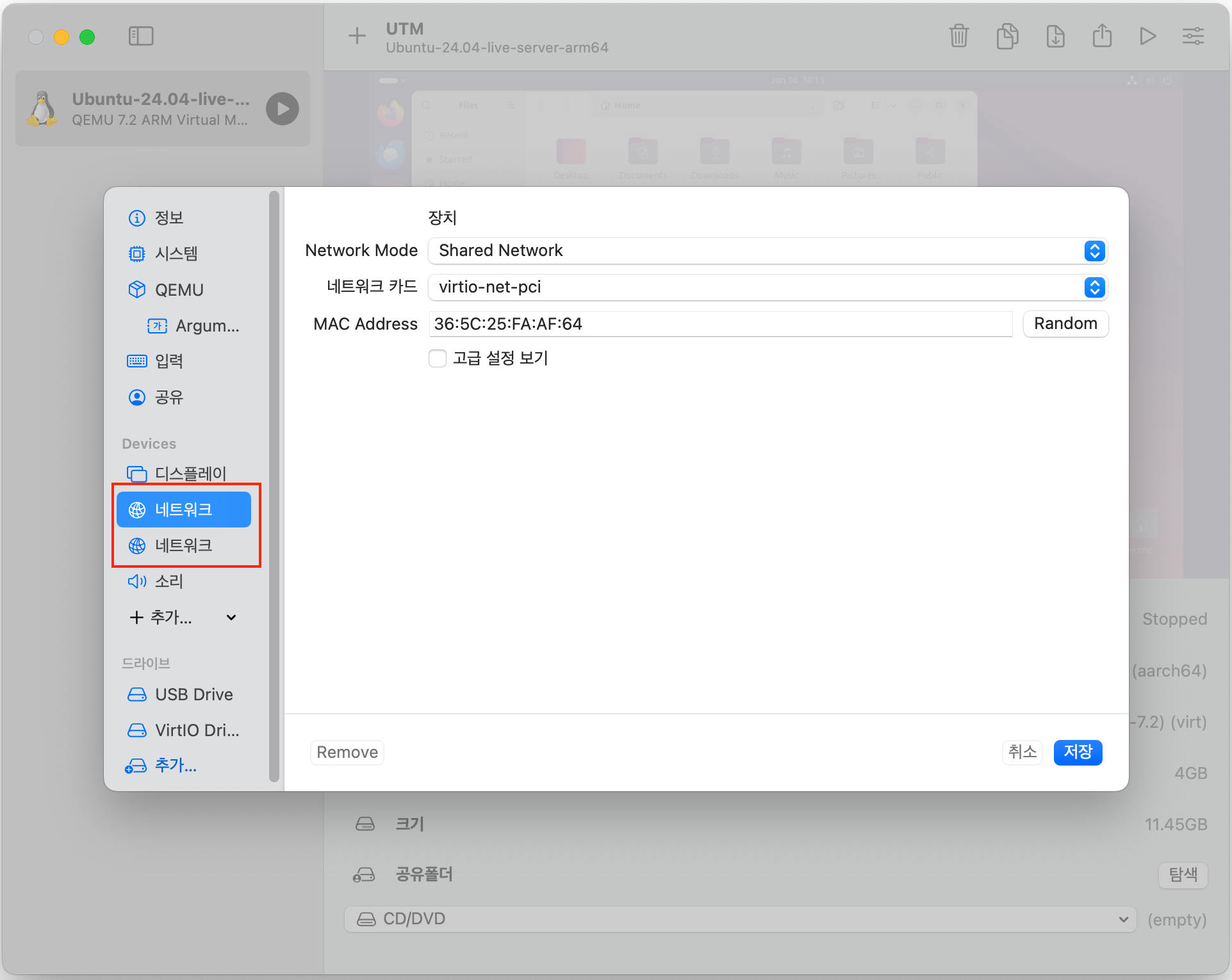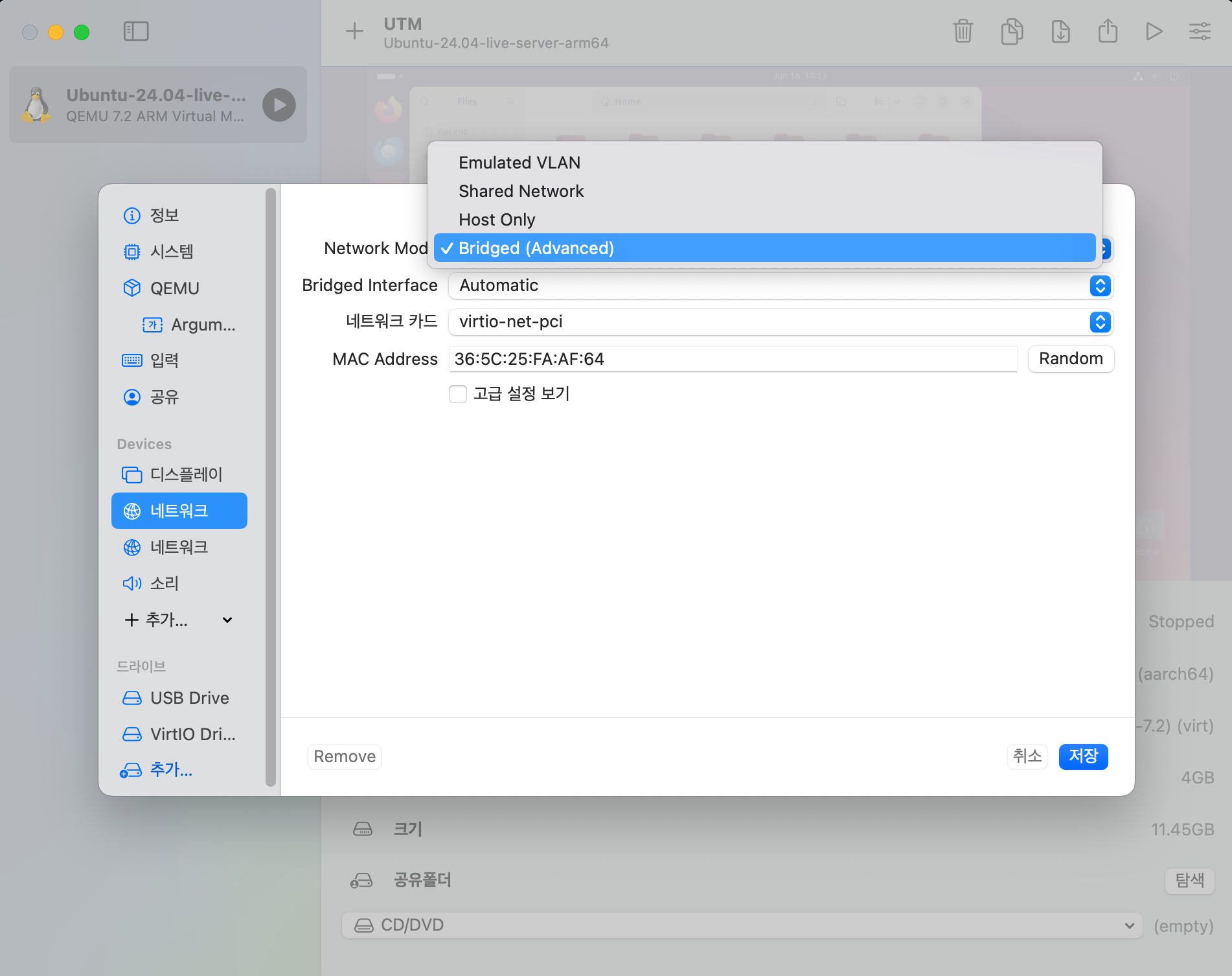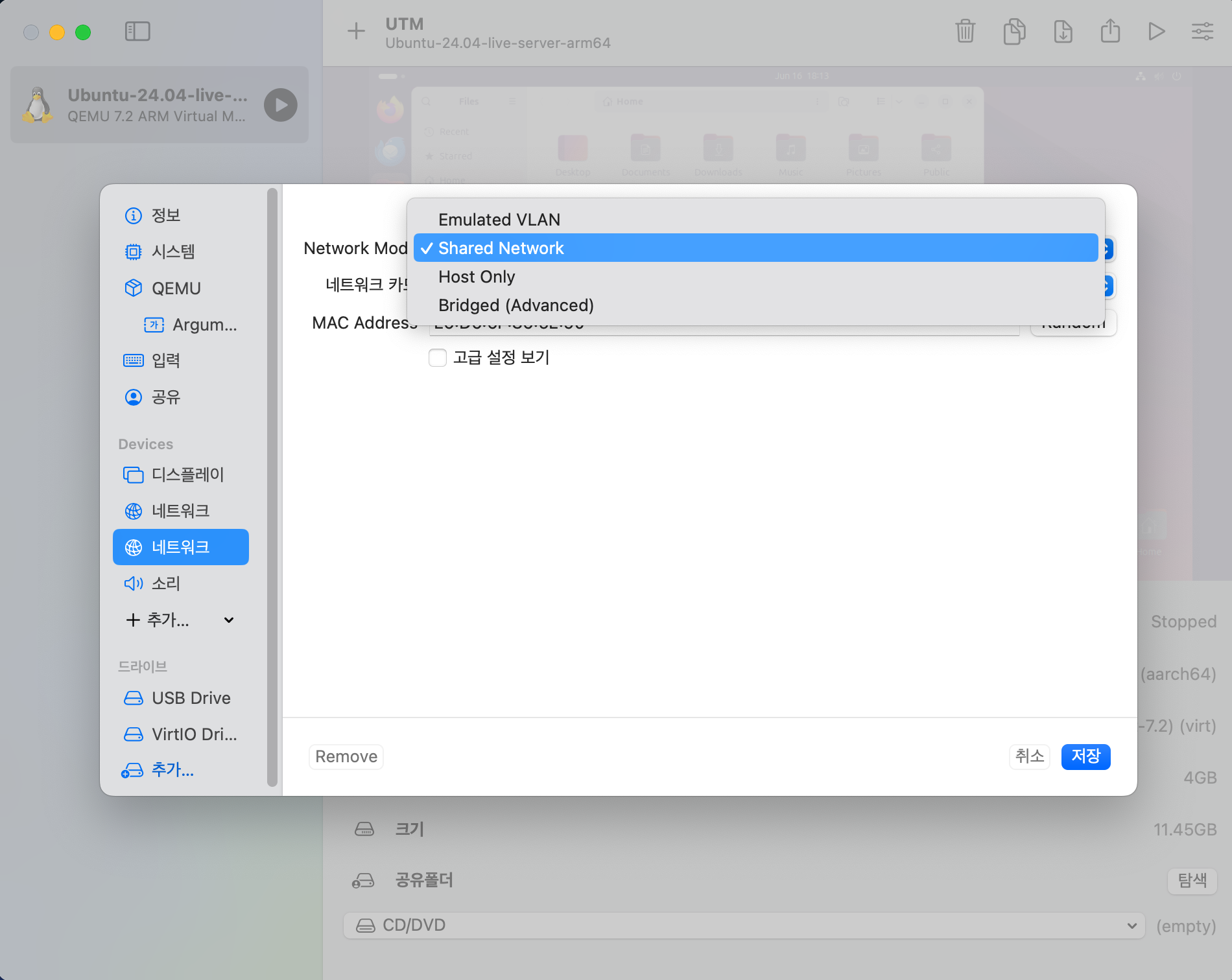 UTM 화면에서 모든 것을 다 제어하고 사용하면 좋겠지만 Oracle을 설치하고 DBMS로 활용하려면 어찌 되었던 UTM외부에서 Ubuntu로의 네트워크 접근이 가능해야 한다. 가상머신이다 보니 별도의 네트워크 설정을 해줘야 한다. 기본적으로 네트워크 아답터가 1개로 설정되어 있는데 네트워크 아답터를 추가하여 외부(UTM 외부)와 연결을 하기 위한 Bridged 역할을 해주기 위해서 네트워크를 추가해야 한다. Bridged 와 Shared Network를 설정해서 가상머신 외부와 연결시키는 방식이다. 이 방식은 꼭 가상머신에서만 사용하는 것은 아니다. 만약 내부 네트워크와 외부 네트워크가 물리적으로 분리되어 있는데 특정 장비만 외부 네트워크와 연결되어야 하는 경우에도 이 방식으로 설정을 해줄 수 있다. 물론 가상머신이 아닌이상 물리적인 Network Adaptor를 추가해서 연결하는 방식이 될 것이다.