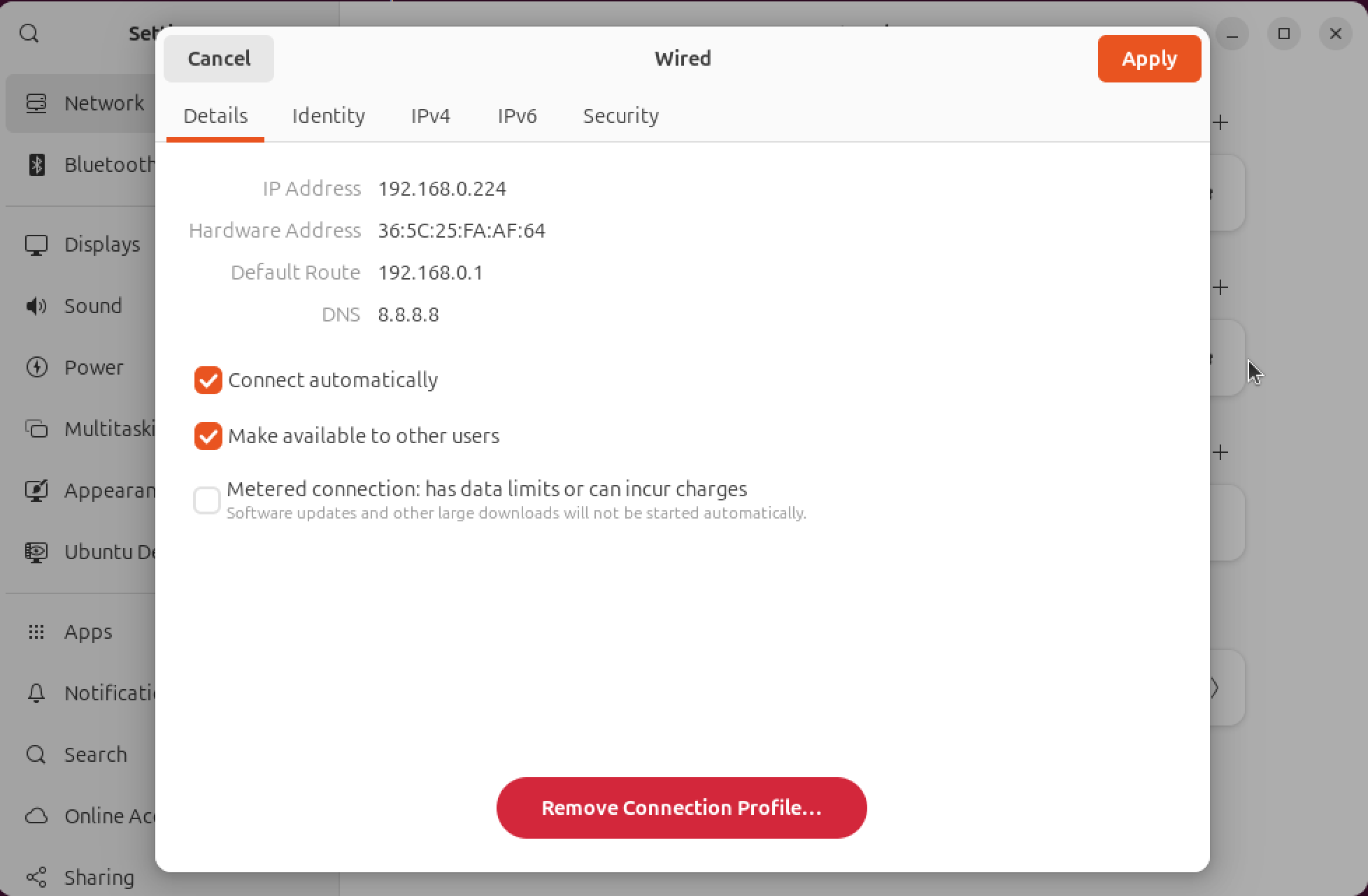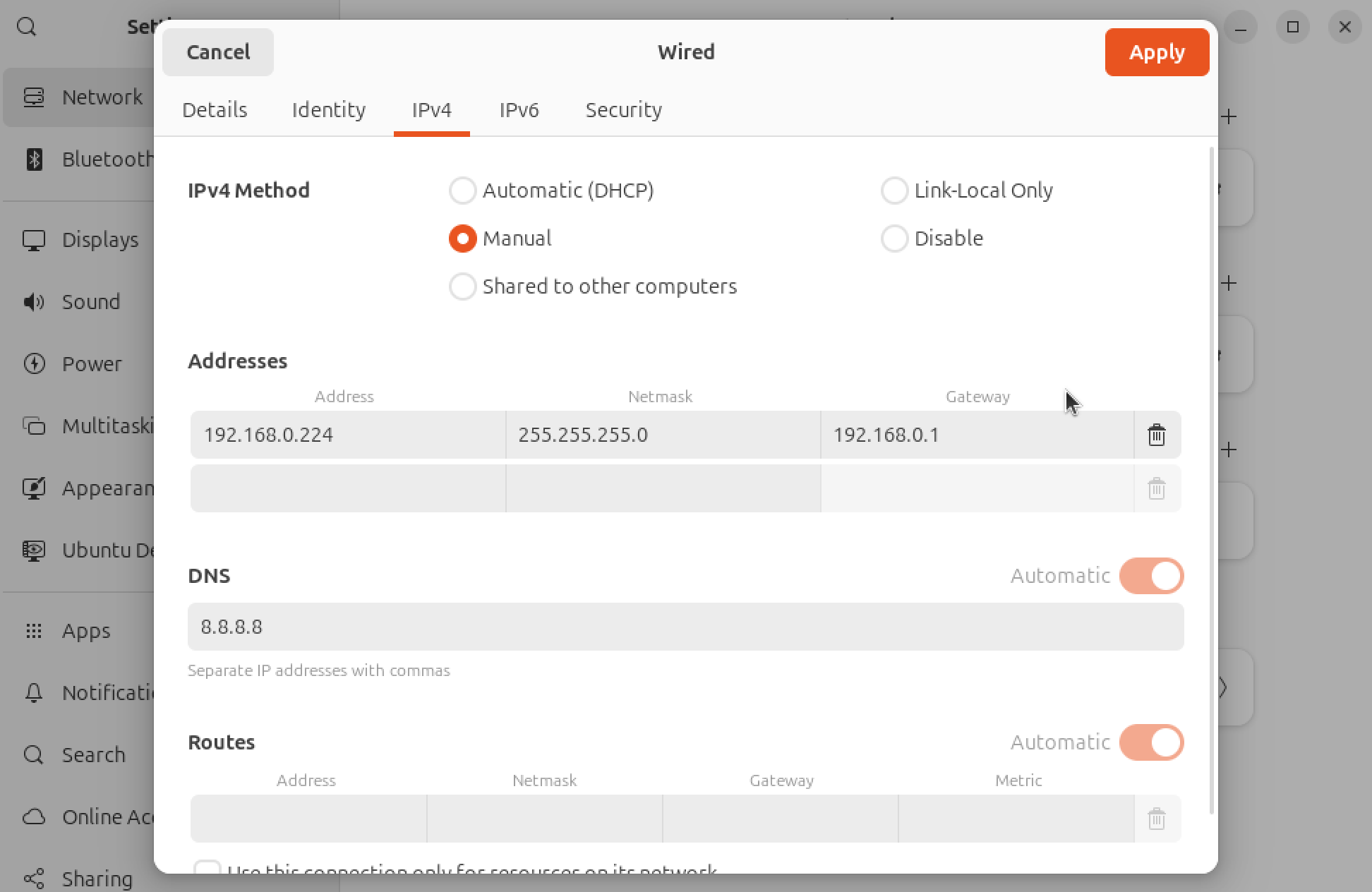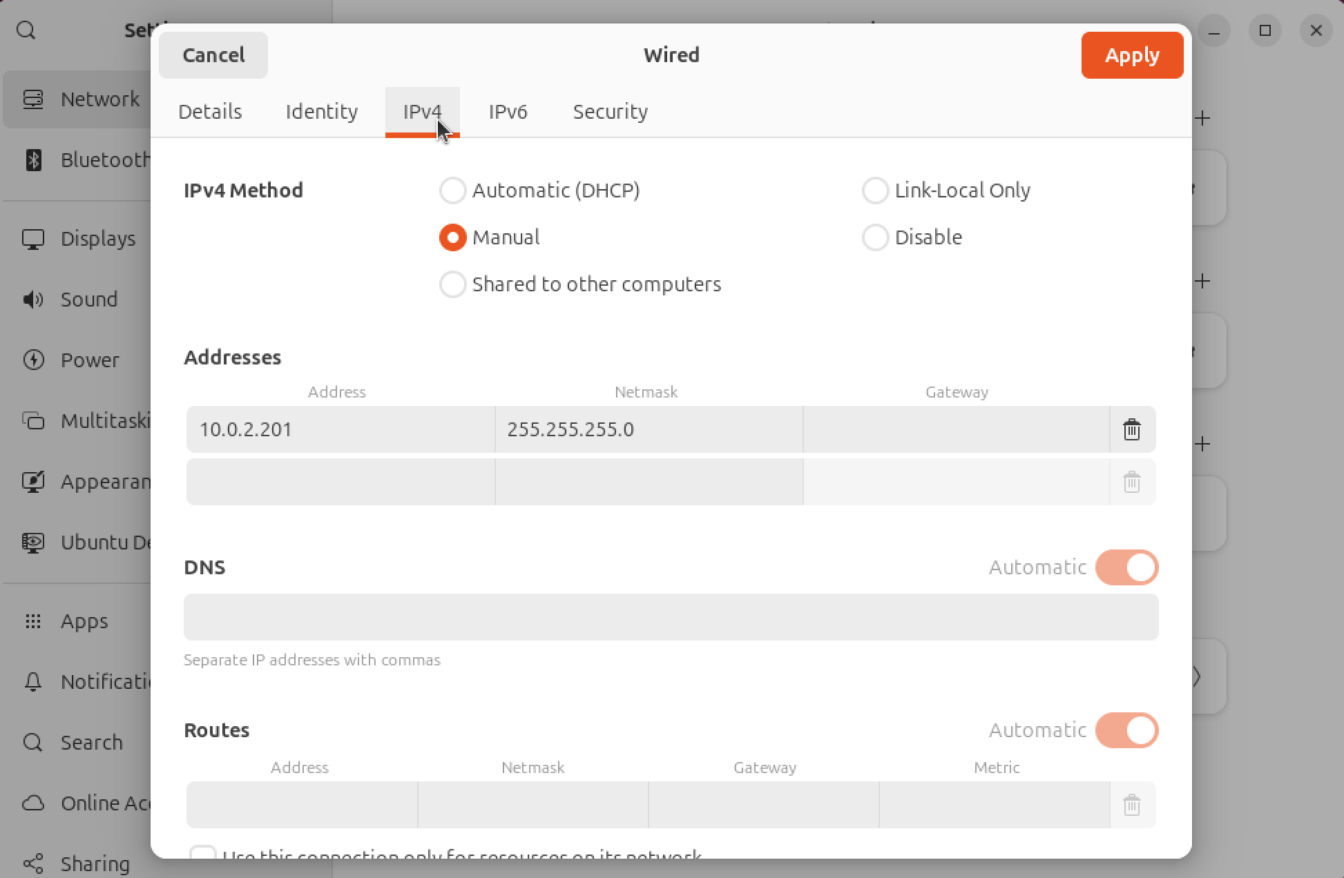 IPv4탭에서 외부와 통신하기 위한 Network IP Setting을 하면 된다. 보통 가정이나 회사에서 공유기나 Router를 사용하는 경우는 위의 사진처럼 192.168.x.x 형태의 주소를 사용할 것이다. 가상머신에게도 같은 주소를 하나 할당 하는 작업이다. 아마도 이미 DHCP로 설정되어 있는 경우라면 자동으로 IP를 할당 받았을 것이다. 그런데 SSH 접속 등의 외부 접속을 설정하기 위해서는 아무래도 DHCP로 변경될 수 있는 IP 설정보다는 Static 으로 설정해 두는 것이 만약을 위해서 좋을 것이다.