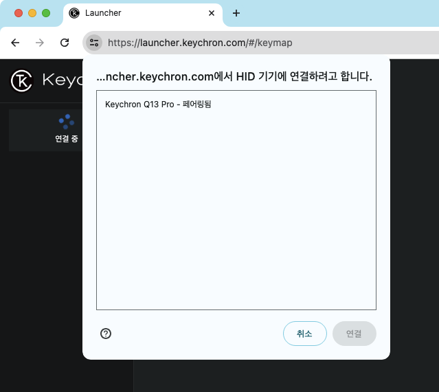 왼쪽 상단의 "장치 연결 +"를 눌러서 현재 연결되어 있는 키보드를 선택하자.