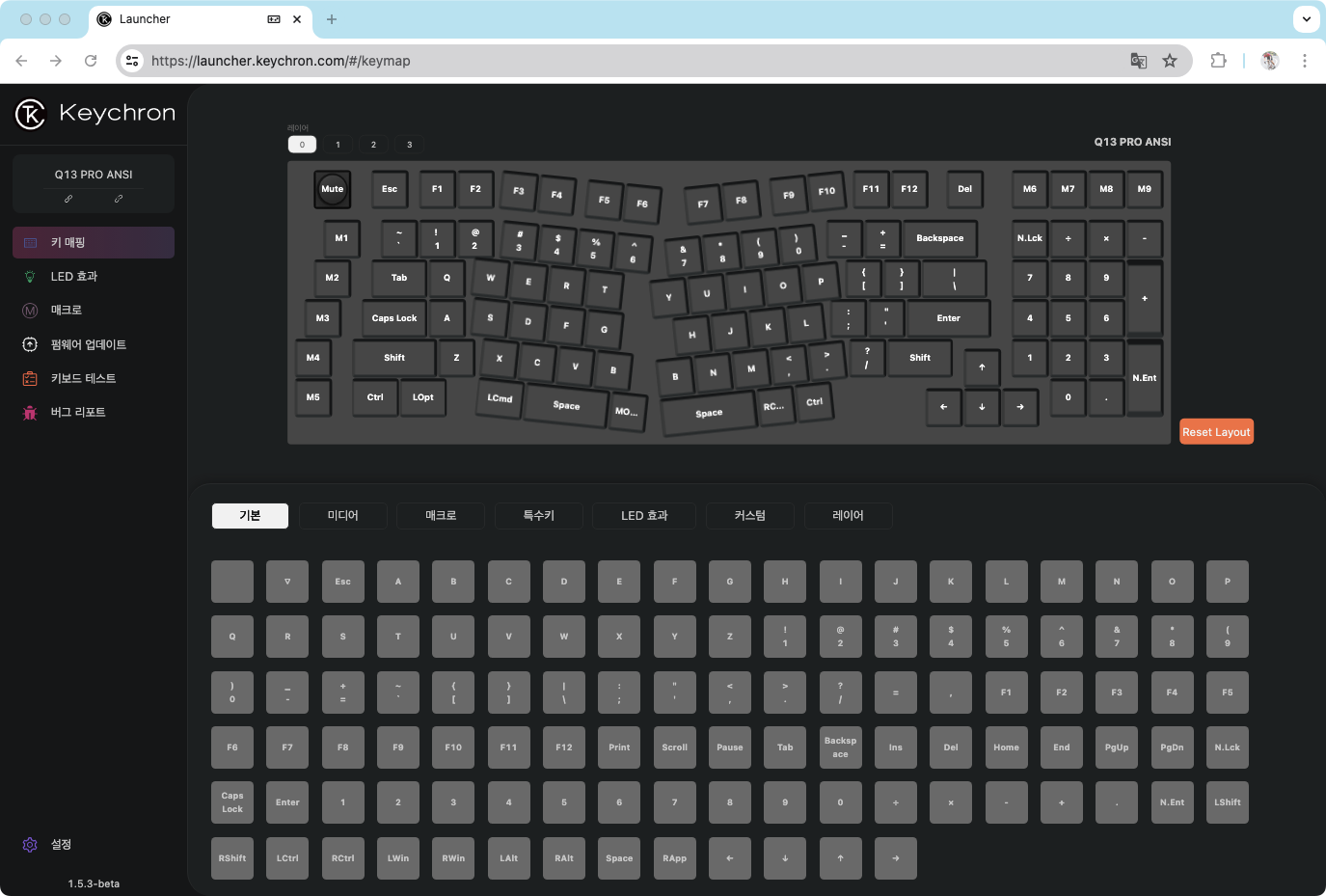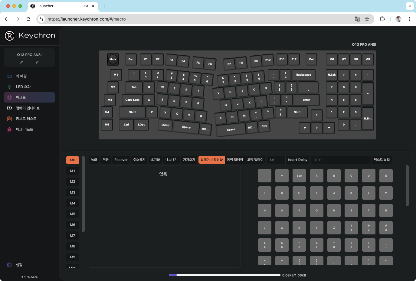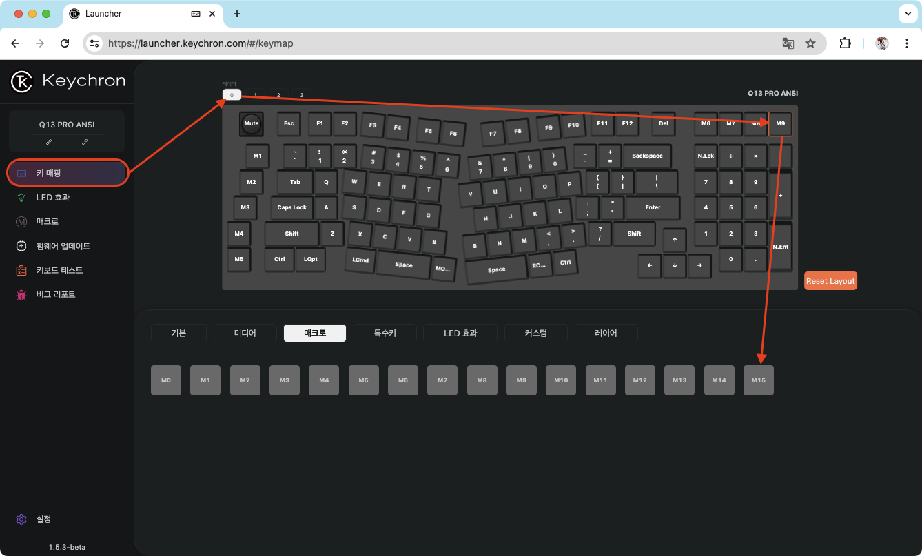 키 매핑 화면을 보면 Q13 기준으로 내가 적용시키고 싶은 키는 오른쪽 상단에 있는 키에 해당 기능을 매핑 시키려고 한다. 매크로 번호라고 할 수 있는 목록이 M0 ~ M15까지 왼쪽에 세로로 보여진다. 마지막 매크로 번호인 M15에 해당 기능을 기록하고 원하는 키에 매핑시키르 예정이다.