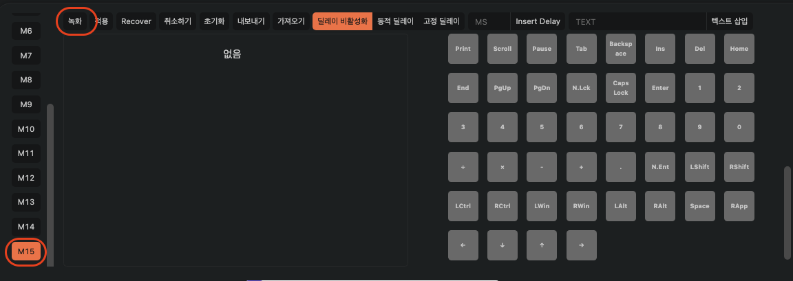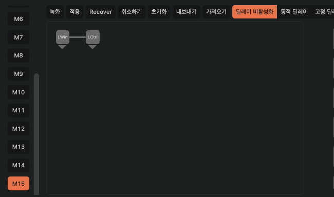 매크로 키 기록은 모두 완료 되었으니 이제 "적용"하고 해당 매크로(M15)를 내가 원하는 키에 적용하고 테스트 해보도록 하자.