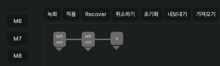 물론 이 걸 "녹화"기능을 사용하지 않고 오른쪽 키 목록에서 선택해서 넣어도 된다. 왕도도 없고 정도도 없다. 자기 편한대로 하면 된다. 이제 ⌘키와 ^키가 눌린 상태에서 Q를 더해보자.