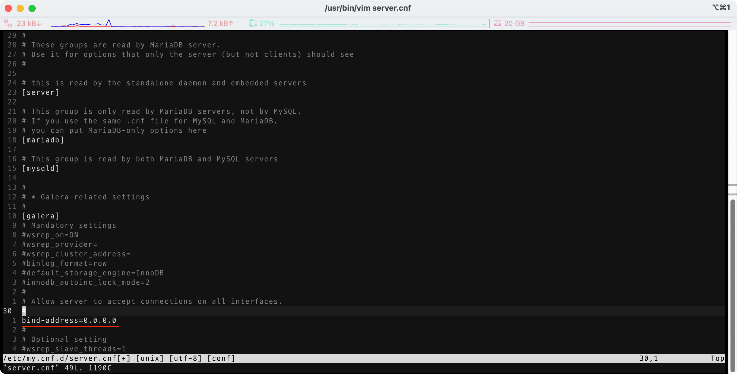 server.cnf 파일을 vi 로 열어서 bind-address=0.0.0.0 으로 되어 있는 설정의 주석을 없애고 저장한다.