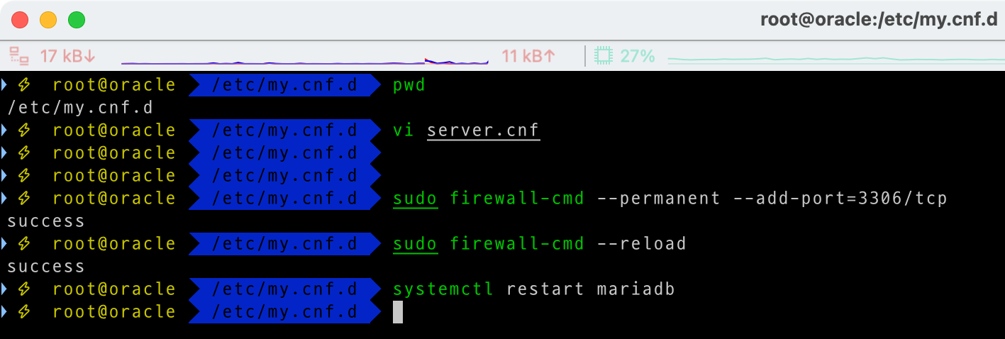 Linux 자체의 방화벽에 3306 포트를 오픈 후 MariaDB를 재기동 한다.