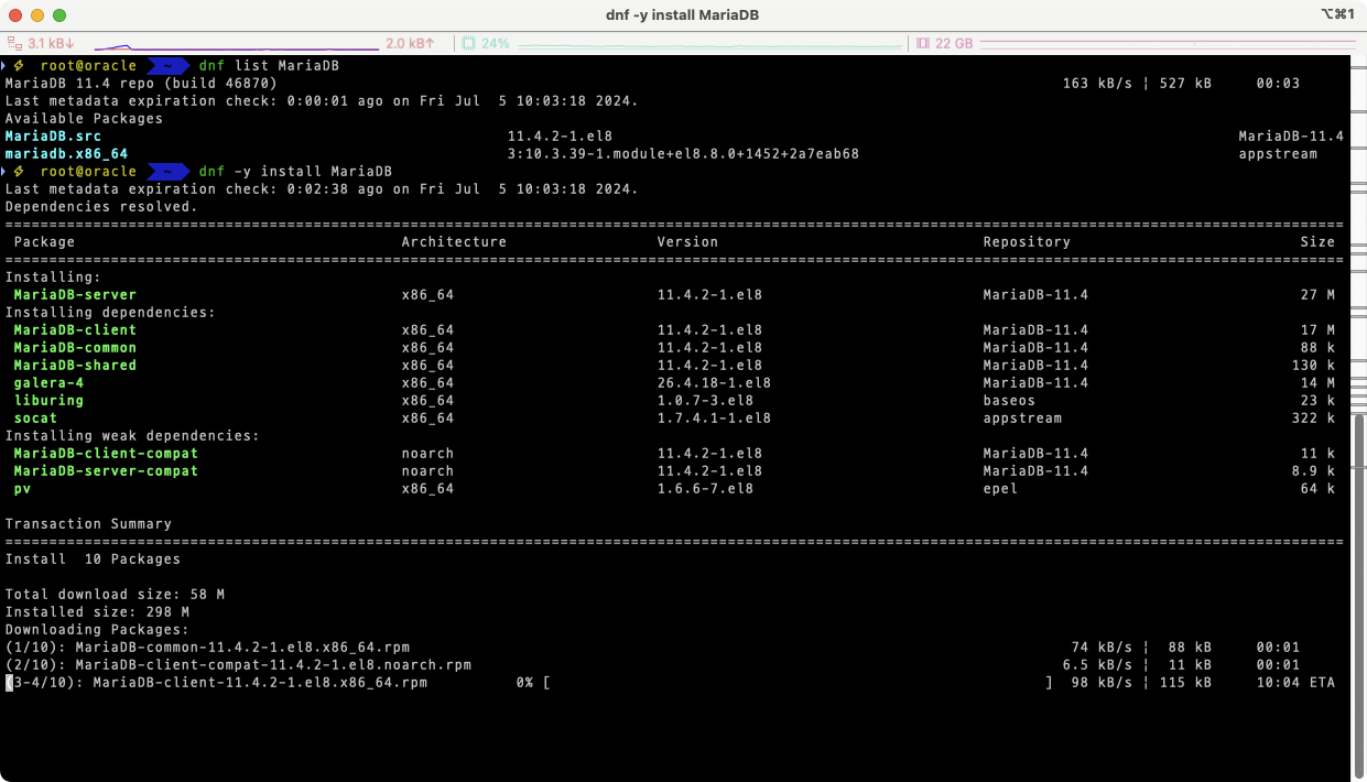 dnf Package Manager를 통해서 MariaDB 11.4.2 를 설치한다.