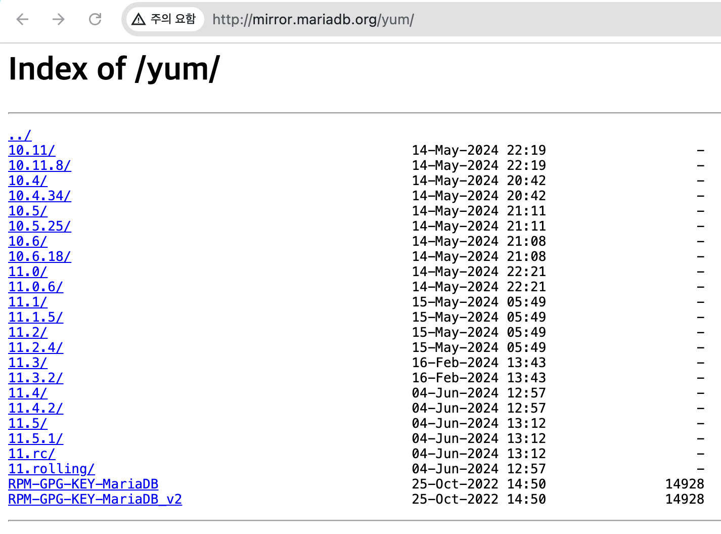 Package 관리 차원에서 Package Manager를 사용하는게 관리상 편할테니 MariaDB 저장소를 추가해서 dnf를 통해 설치 할 수 있는 최신 버전을 설치하도록 한다. 그러기 위해서는 MariaDB 저장소를 추가해야 한다. 먼저 yum을 통해서 설치 할 수 있는 MariaDB의 Version을 확인해 보자. http://mirror.mariadb.org/yum/