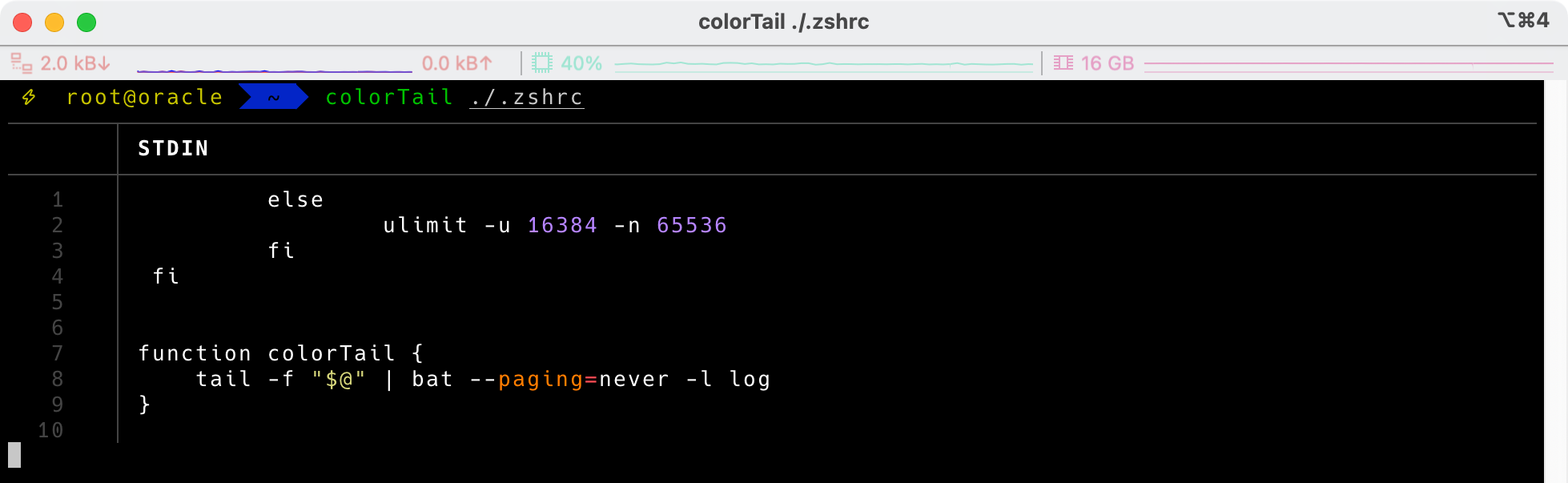 행번호와 Syntax Highlight 가 되는 것만으로도 충분히 cat을 대체해서 쓸 이유는 충분하다. 더불어 앞서 이야기 한 대로 다른 명령어들과 조합해서 사용하면 더욱 그 진가를 발휘한다.