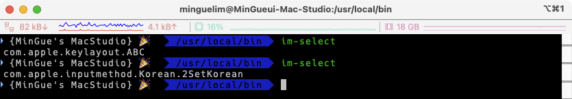 만약 위의 shell을 실행했을 때 한/영 전환이 정상적이지 않다면 현재 입력 상태를 표기하는 값을 출력해보고 표기되는 값으로 스크립트 내용을 자신의 환경에 맞게 수정하자. 현재의 입력 소스를 출력하는 방법은 앞서 설치된 im-select를 실행하면 된다. 아래의 Capture에서 보는 것처럼 처음에는 영문상태에서 im-select를 실행했고 두번째는 한글 상태에서 실행한 것이다. 사용자별로 어떤 경우에는 com.apple.keylayout.ABC 대신에 com.apple.keylayout.US 인 경우도 있을 수 있기 때문에 확인해보고 해당 입력 소스 이름으로 위의 스크립트를 수정해주면 된다.