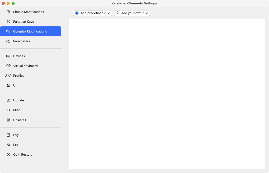 위의 Capture에서 처럼 Karabiner-Elements를 실행하고 Complex Modifications를 선택하면 "Add your own rule" 이라는 버튼을 볼 수 있다. 해당 버튼을 눌러 새로은 규칙을 만들고 아래의 스크립트를 입력한다. 그리고 저장.