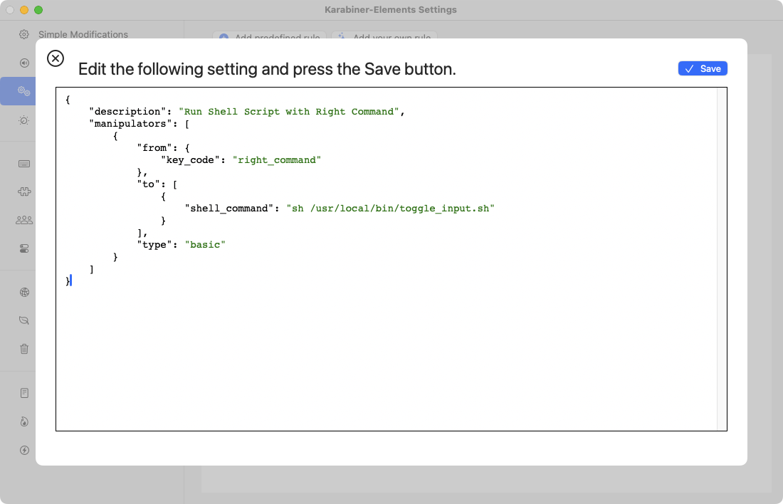 위의 Capture에서 처럼 Karabiner-Elements를 실행하고 Complex Modifications를 선택하면 "Add your own rule" 이라는 버튼을 볼 수 있다. 해당 버튼을 눌러 새로은 규칙을 만들고 아래의 스크립트를 입력한다. 그리고 저장.