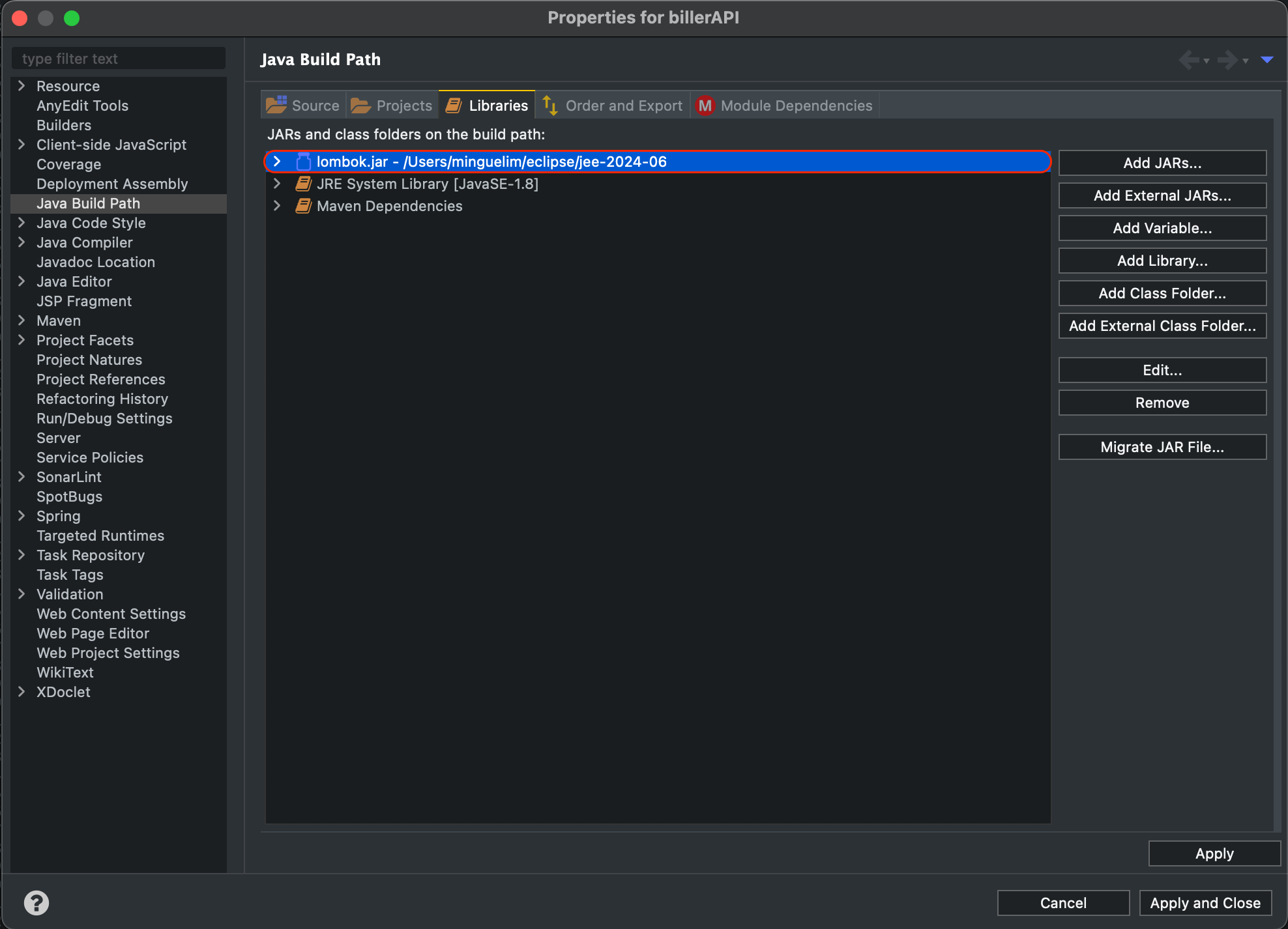 만약 Lombok을 설치하고도 getter / setter 부분에서 빨간줄로 에러가 난다면 Build Path의 내용을 확인해 봐라. lombok.jar 가 build path에 잡혀 있지 않다면 수동으로 추가해주면 해결 된다.