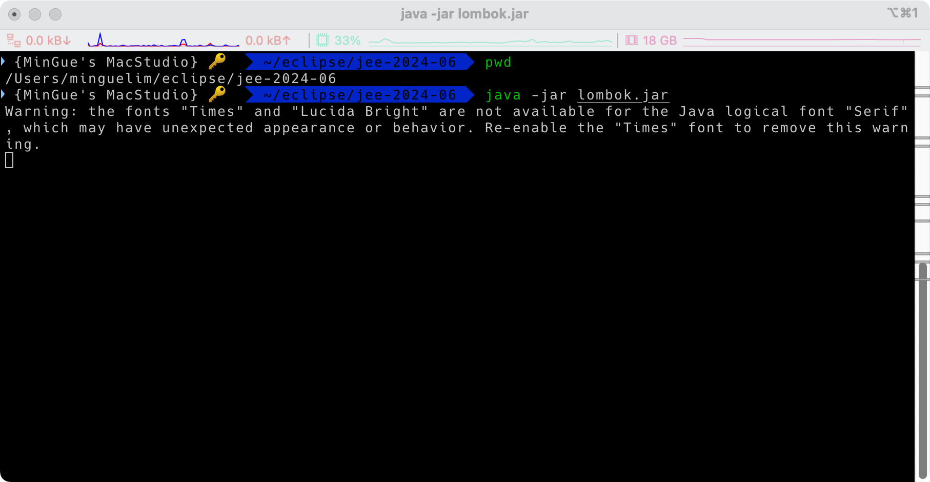 다운로드 받은 lombok.jar를 이클립스가 설치된 디렉토리로 이동을 하고 Console 화면에서 java -jar 명령어로 실행해준다.