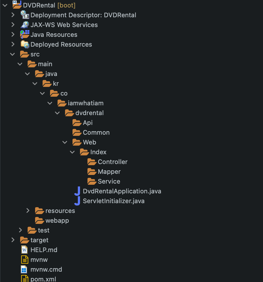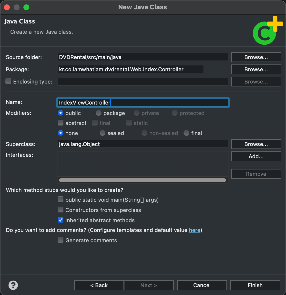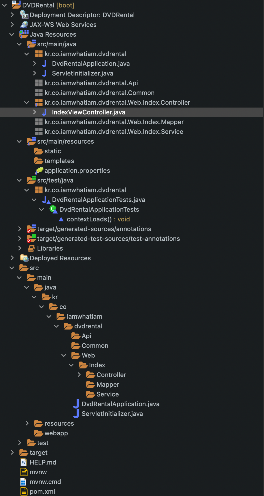 이번 포스팅에서 할 'Hello World' 출력은 Web Service 첫 화면에서 출력하게 할 예정이므로 Index Directory에 코딩을 하기로 한다. src/main/java/kr/co/iamwhatiam/dvdrental/Web/Index/Controller 에 IndexViewController.java Class 를 생성하자.
