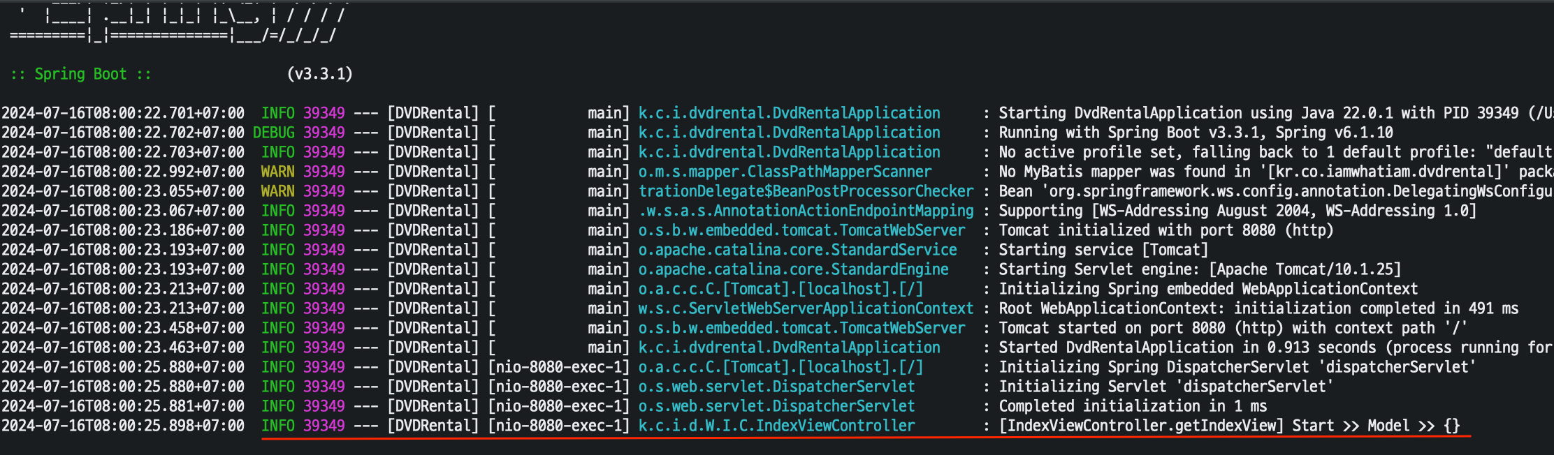 - logging.level.kr.co.iamwhatiam.dvdrental=TRACE : 'kr.co.iamwhatiam.dvdrental' Package에 대한 Log Level을 'Trace'로 설정했다. 이 Package의 모든 Log Message가 출력된다. 'Trace'는 가장 낮은 Log Level로 상세한 Debugging을 위해서 유용하게 사용된다.