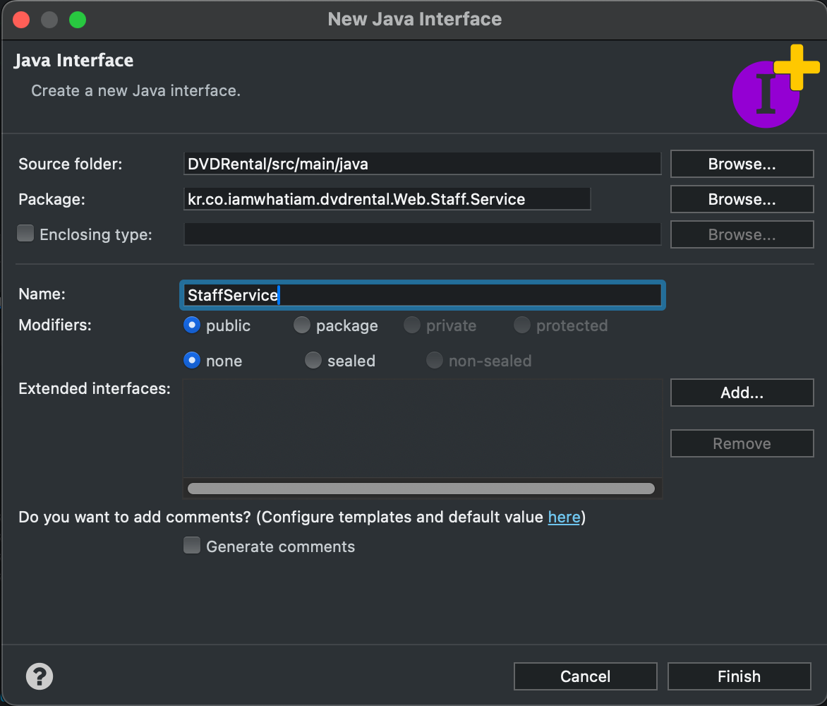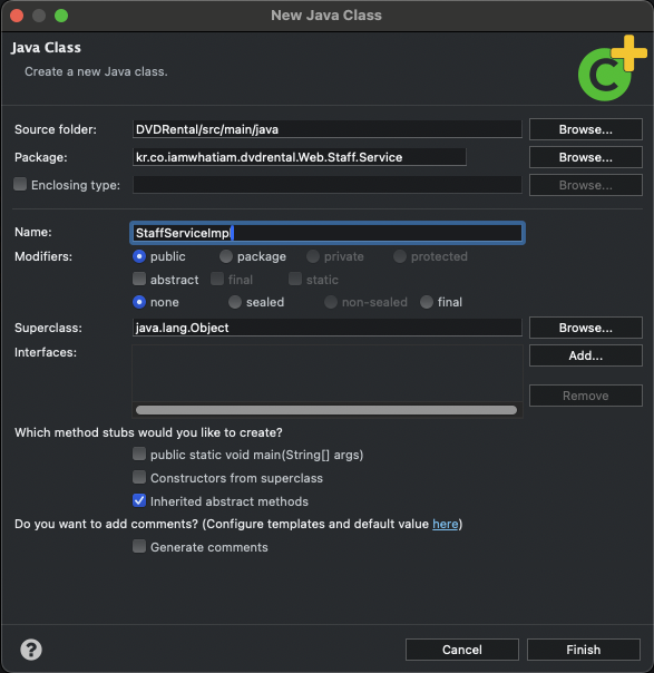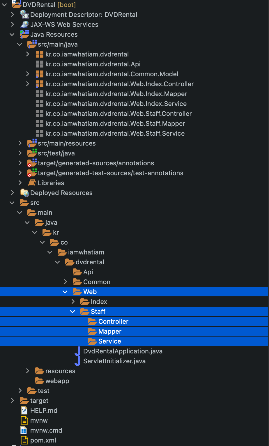 'src/main/java/kr/co/iamwhatiam/dvdrental/Web/Staff/Service'에 'StaffServiceImpl.java' Class를 만든다. 이 Class 도 역시나 getStaffInfoList는 Map 객체로 인수를 받아서 List 형태로 Return 할 것이고, getStaffInfoByID는 Staff 구조체로 인수를 받아서 단일 Data로 Return 할 것이다.