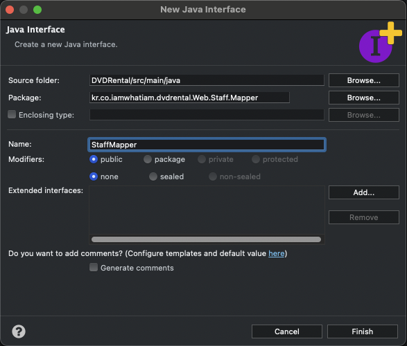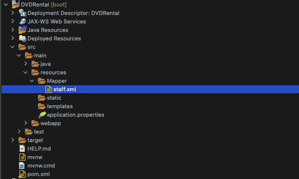 'src/main/java/kr/co/iamwhatiam/dvdrental/Web/Staff/Mapper'에 'StaffMapper.java' Interface를 만든다. getStaffInfoList는 Map 객체로 인수를 받아서 List 형태로 Return 할 것이고, getStaffInfoByID는 Staff 구조체로 인수를 받아서 단일 Data로 Return 할 것이다.