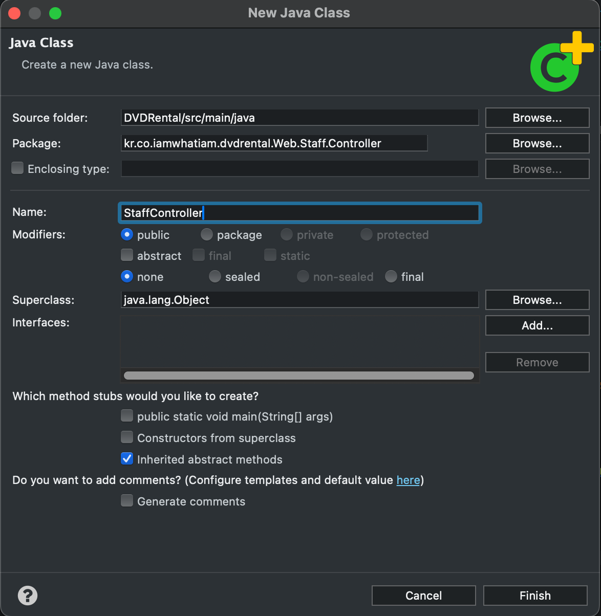 Project에 'kr.co.iamwhatiam.dvdrental.Common.Model' Package를 만들든 Folder를 생성해서 Directory 구조를 만들든 Common 밑에 Model Directory를 생성해서 그 안에 'DVDRentalBaseModel.java' , 'Staff.java' Class를 생성한다.