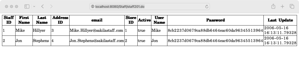 여기까지 단계별로 진행했다면 Web Service를 구동하고 http://localhost:8080/Staff/staff201.do 에 접속을 해보면 아래와 같이 dvdrental Database의 staff table의 목록이 출력될 것이다.