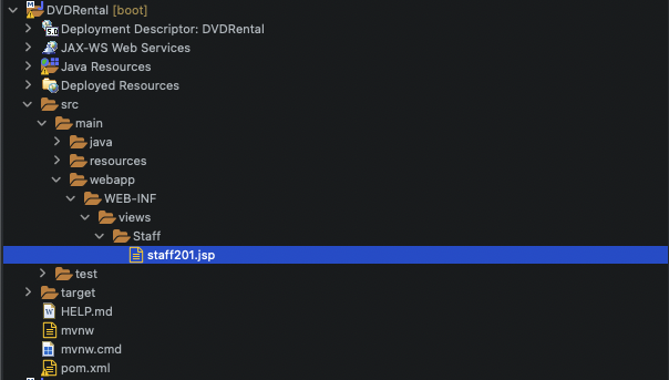 'src/main/webapp/WEB-INF/views/Staff' Directory를 생성한다. 그 안에 'staff201.jsp' 라는 이름으로 JSP File을 생성한다. 이 Project에서 사용되는 view file의 Naming Rule을 정하고 가겠다. 즉, 'staff201.jsp' File은 Staff Table에 대한 Select View 화면이 되는 것이다. 실제는 Select 하기 위한 요청화면이 201이지만 DB의 정보를 정상적으로 가져오는지 테스트하기 위함이니 201을 사용하도록 하겠다.