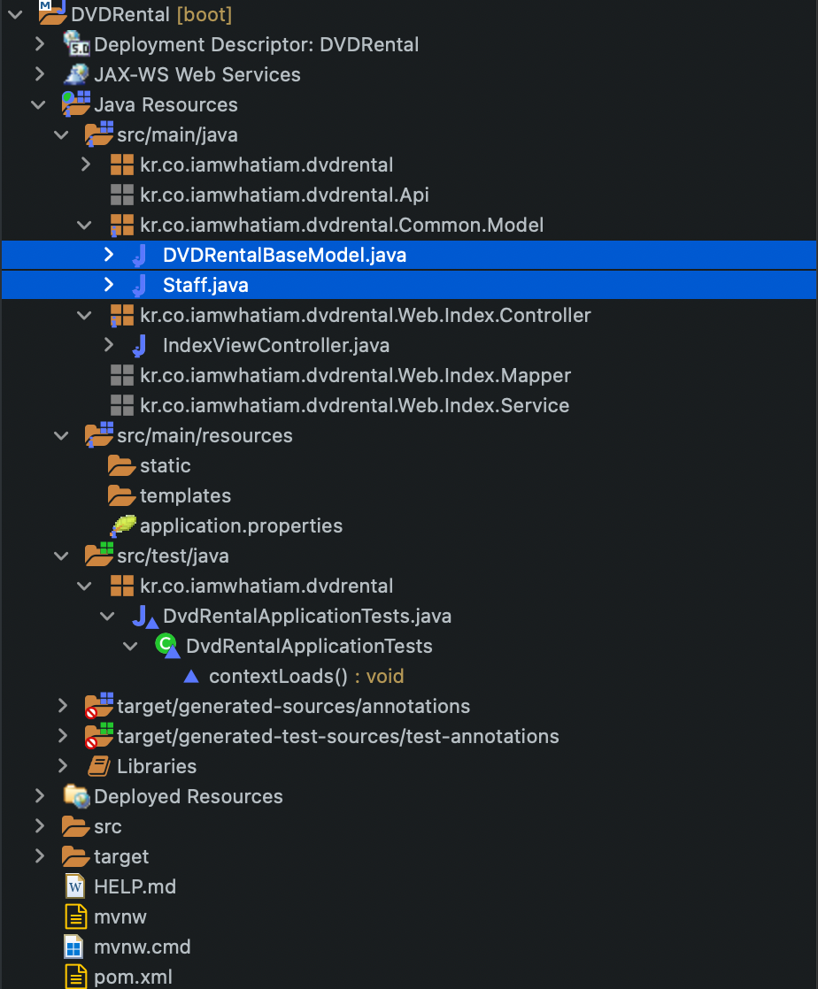 Project에 'kr.co.iamwhatiam.dvdrental.Common.Model' Package를 만들든 Folder를 생성해서 Directory 구조를 만들든 Common 밑에 Model Directory를 생성해서 그 안에 'DVDRentalBaseModel.java' , 'Staff.java' Class를 생성한다.