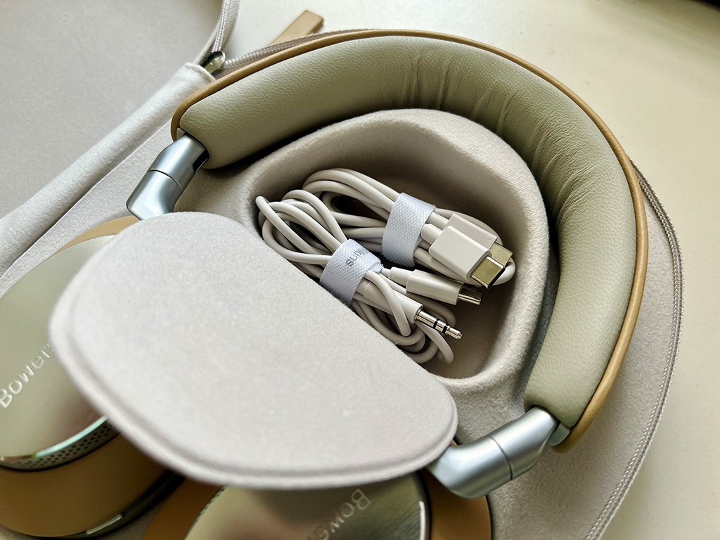 나파 가죽이 매우 부드럽고 얇아서 주름이나 이염이 될 것 같아 관리를 잘해야 할 것 같다. 케이스 안쪽에는 자석으로 열리고 닫히게 되어 있는 공간이 있는데 그곳에는 C to C Type USB Cable과 3.5mm to USB C Type Cable이 동봉되어 있다. C to C 케이블은 충전용도로 사용되기도 하지만 USB-C Type의 기기와 연결해서 음악 청취를 위한 유선용도로도 사용된다.