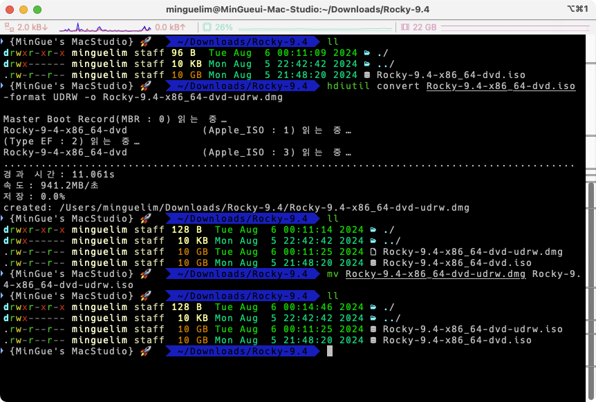 - -o Rocky-9.4-x86_64-dvd-udrw.dmg : 변환된 결과를 저장할 파일의 이름을 지정한다.