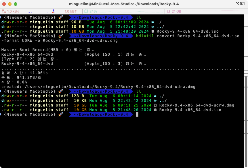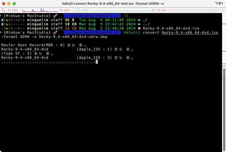 - -o Rocky-9.4-x86_64-dvd-udrw.dmg : 변환된 결과를 저장할 파일의 이름을 지정한다.