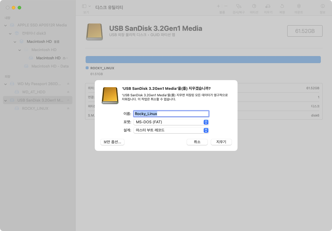 먼저 생성할 이미지 파일의 크기보다 큰 사이즈의 USB를 준비한다. Rocky Linux 9.4 x86_64 DVD ISO의 경우 약 10.92GB의 크기이다. USB Memory는 64GB 로 준비했다. 준비한 USB를 Format 한다. 디스크 유틸리티를 사용하여 초기화 하자.