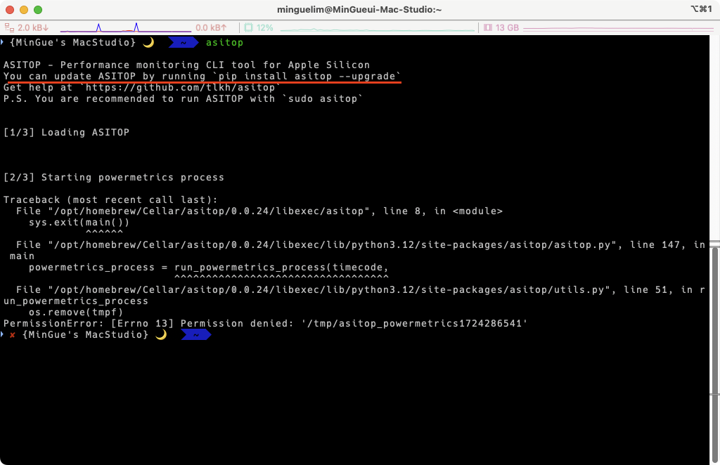 Github의 정보(https://github.com/tlkh/asitop)를 보면 최소 1년정도 된 내용인 것으로 확인이 되는데 개발자가 더이상 업데이트를 하고 있지 않은 듯 싶다.