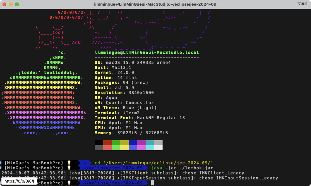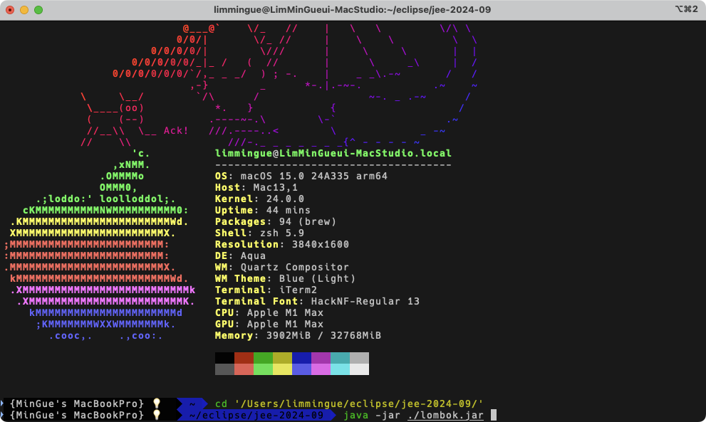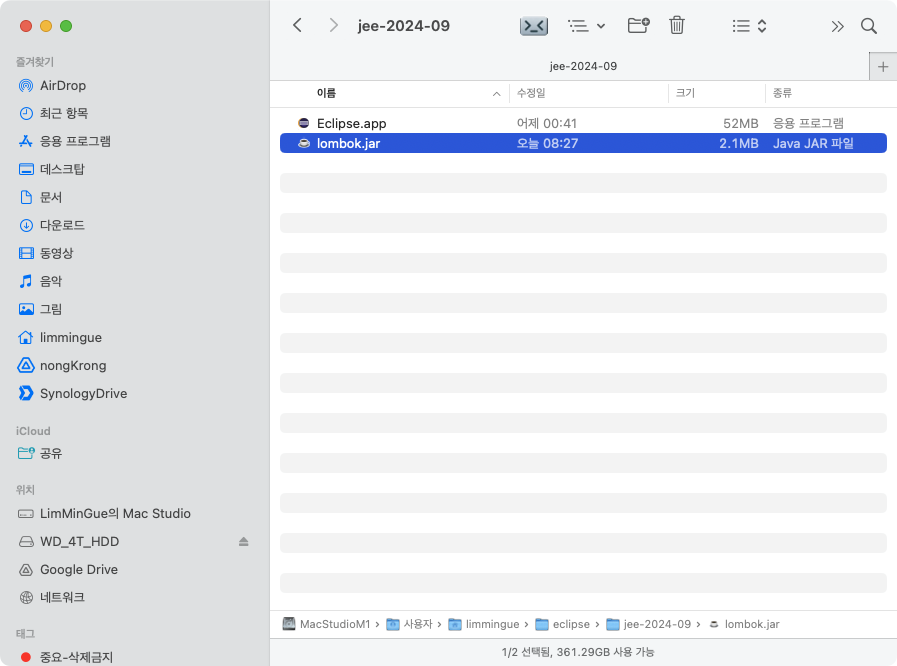 Terminal에 해당 경로로 이동해서 lombok.jar를 실행시켜 준다.