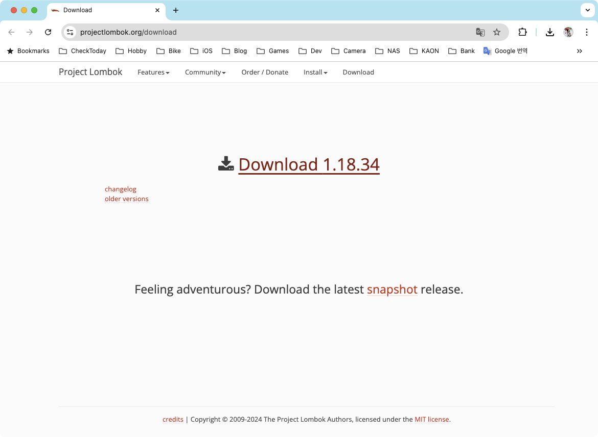 일단 최신 버전을 다운로드 받는다. 2024년 10월 3일을 기준으로 최신버전의 Lombok.jar는 1.18.34 이다. projectlombok.org에서 다운로드 받아서 Eclipse가 설치된 곳에 함께 위치해 준다.