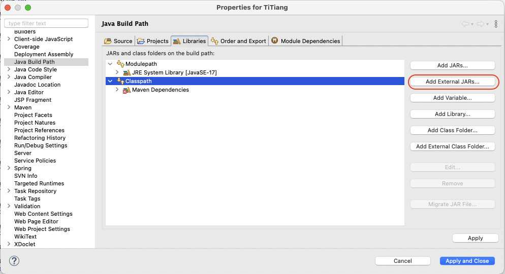 설치는 완료 됐다. 그런데 간혹 Eclipse에서 인식을 못하는 경우가 있다. 그런 경우에는 해당 Project의 Properties에서 Jaba Build Path > Libraties 에서 Classpath에 누락된 lombok.jar를 Add External JARs 를 눌러서 추가해 주면 된다.